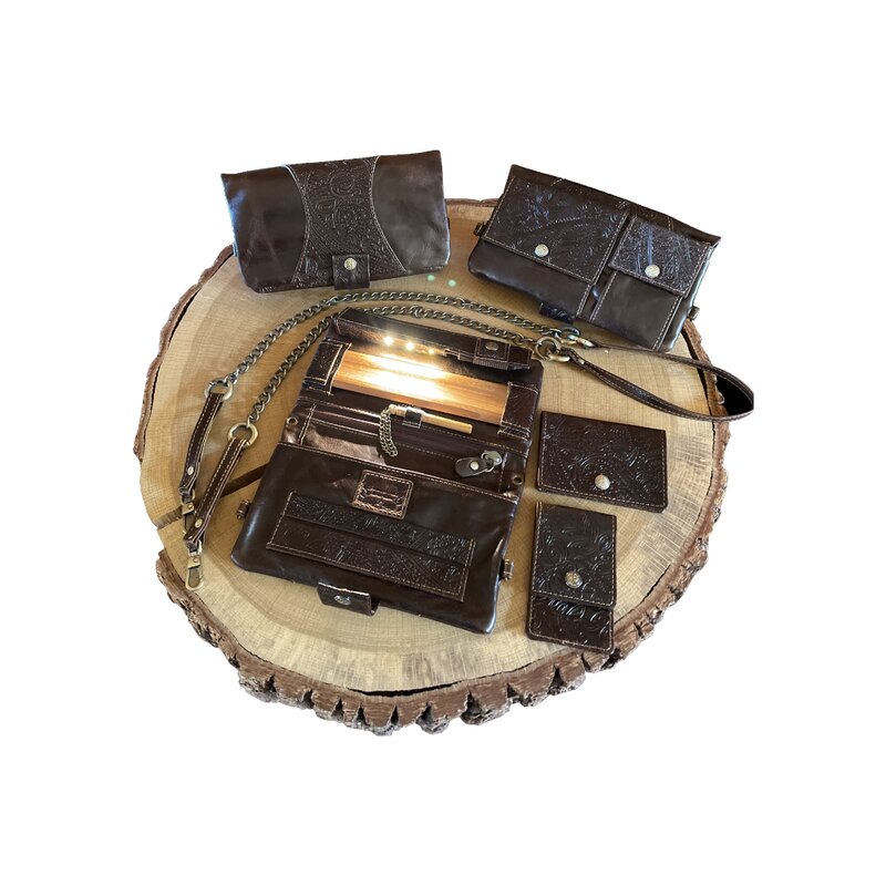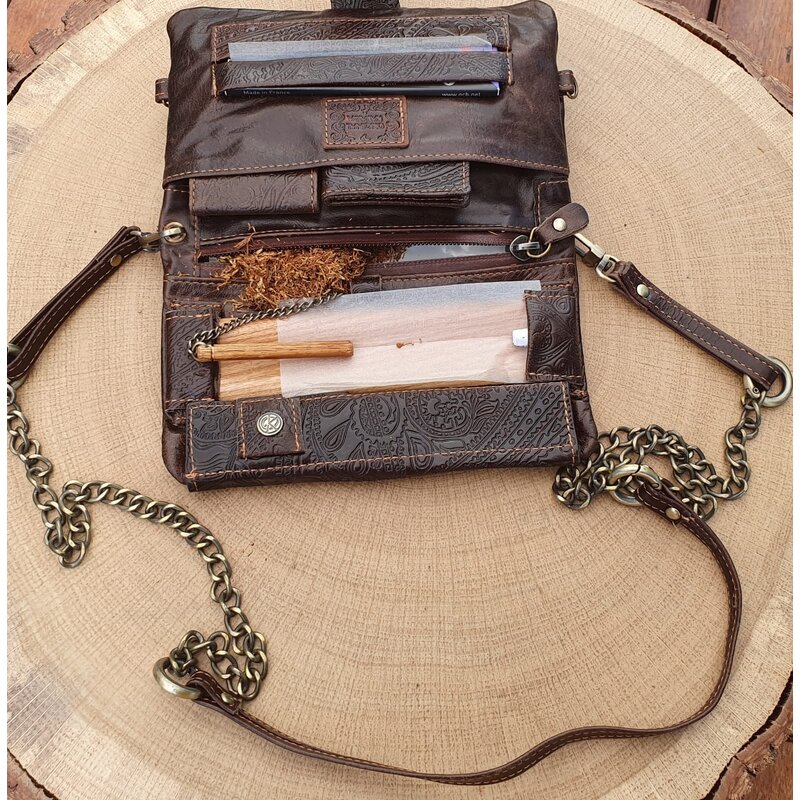 Die Joint Tasche „Ethnic Advanced“ aus braunem Leder, geprägt mit Paisley Muster im Hosentaschenformat ist ein unverzichtbarer Begleiter eines Cannabis Connaisseur. Zeitlos, langlebig und jederzeit einsetzbar. Die Joint Tasche mit LED Licht an der Drehablage, King Size Blättchenhalter, eigenem Taschenaschenbecher und geruchsminderndem Aufbewahrungsfach für Cannabis, bietet mit zwei Innentaschen genügend Platz, um Tabak, Blättchen, Filter und Feuerzeug unterzubringen. Alles findet seinen Platz, ist wohl durchdacht und du hast mit einem Griff alles zur Hand. Sie kann mit den Lederlaschen direkt am Gürtel oder in der Hosentasche mit der Kette gesichert werden.